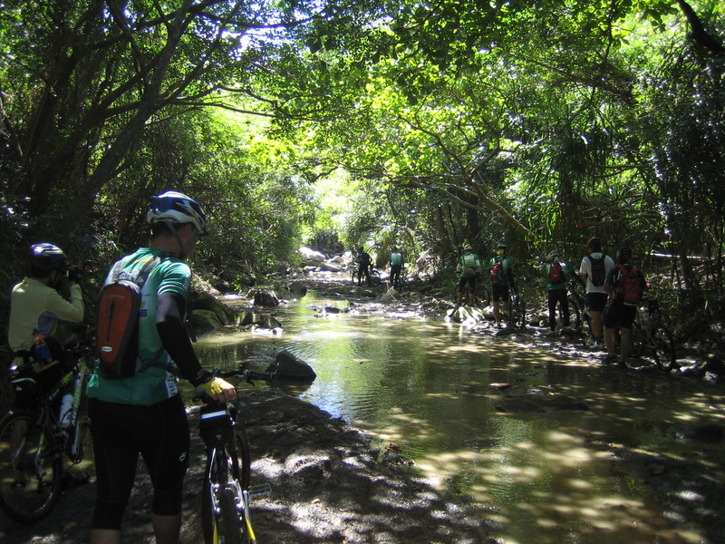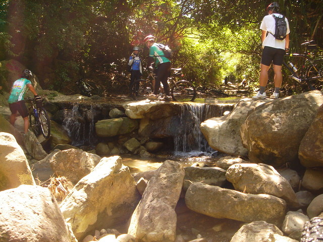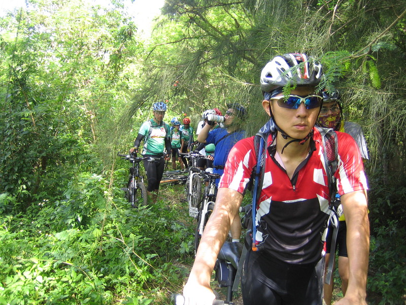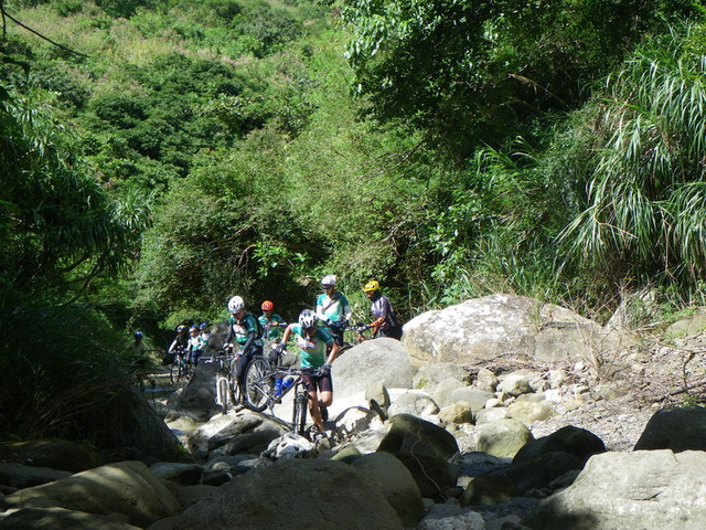 沿著河床旁的小徑左轉上山,推著車、扛著車穿越樹林一路往上爬,