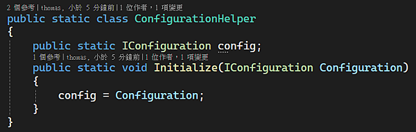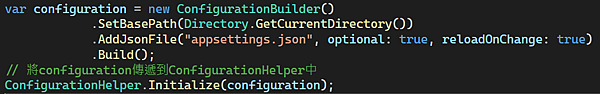 2. 在Program.cs中,完成Configuration的設置(例如取得appsetting.json內的資料庫連線資料),接下來再把Configuration傳遞到剛剛建立的ConfigurationHelper靜態類別中。