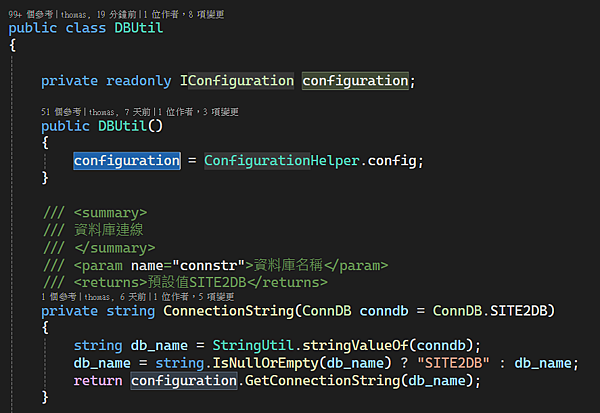 3. 最後在我們自已的公用程式物件,在建構子來取得靜態類別ConfigurationHelper來取得需要的內容,透過Configuration.GetConnectionString的方式來存取appsettings.json的連線資訊。